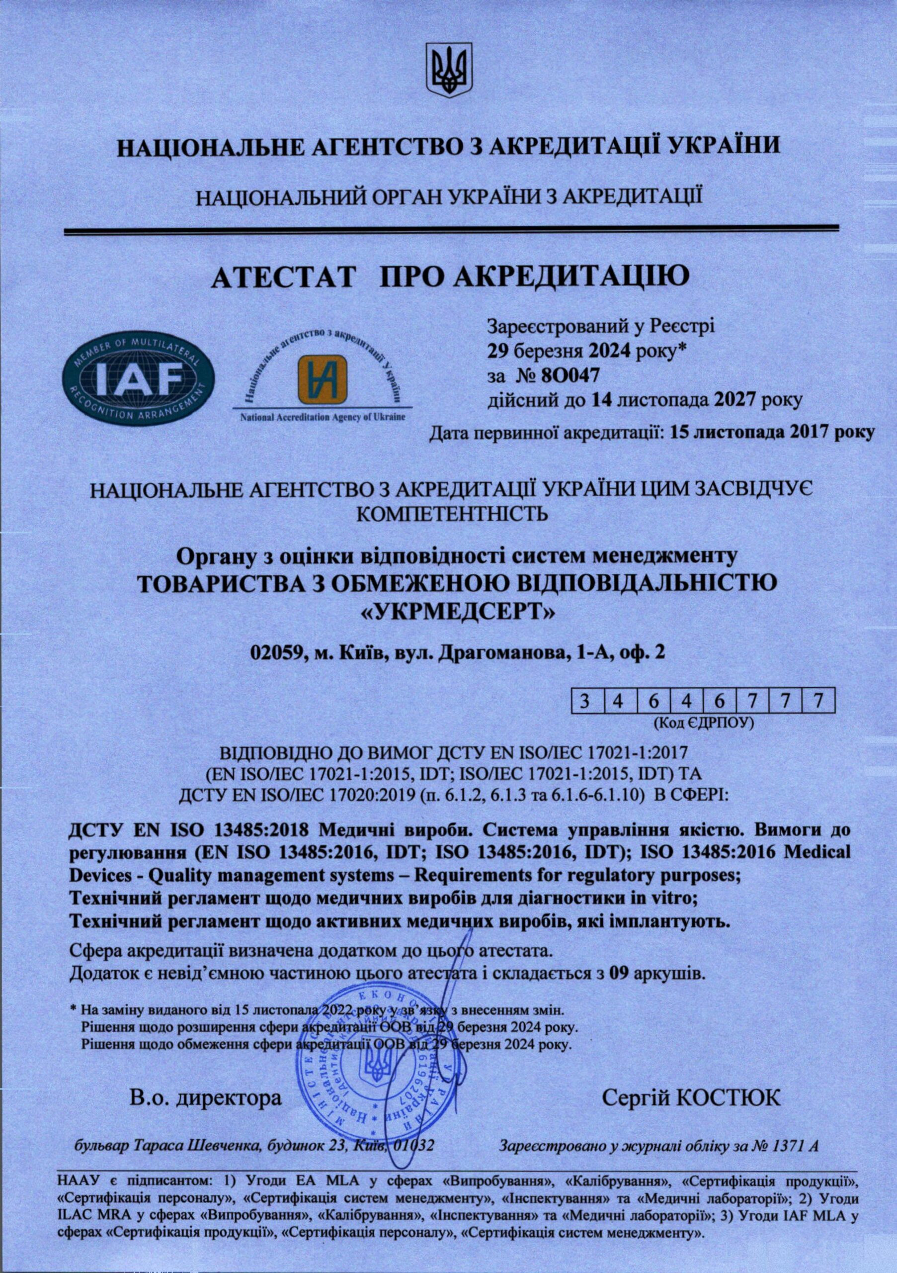 якості вимогам стандартів ISO 13485: 2016, атестат акредитації Національного агентства з акредитації України №80047